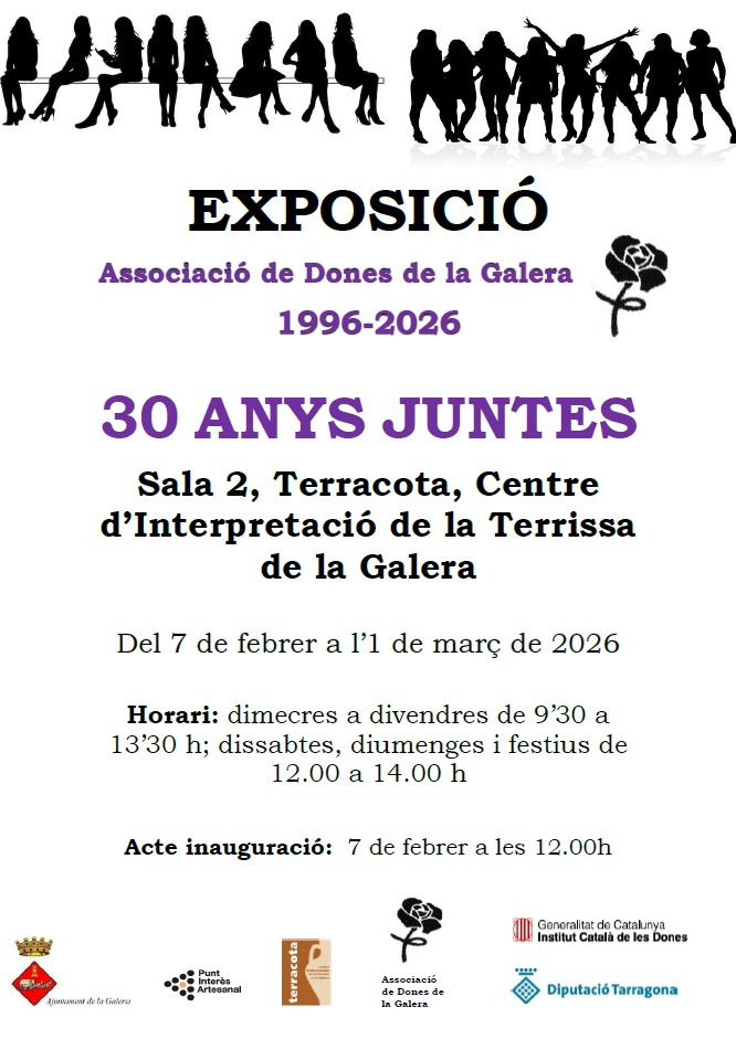Del 7 de febrer a l’1 de març de 2026, la Sala 2, sala d'exposicions temporals de Terracota, Centre d'Interpretació de la Terrissa de la Galera (baixos de l’Ajuntament) acollirà una exposició commemorativa dels 30 anys de l’Associació de Dones de la Galera: “30 anys juntes”