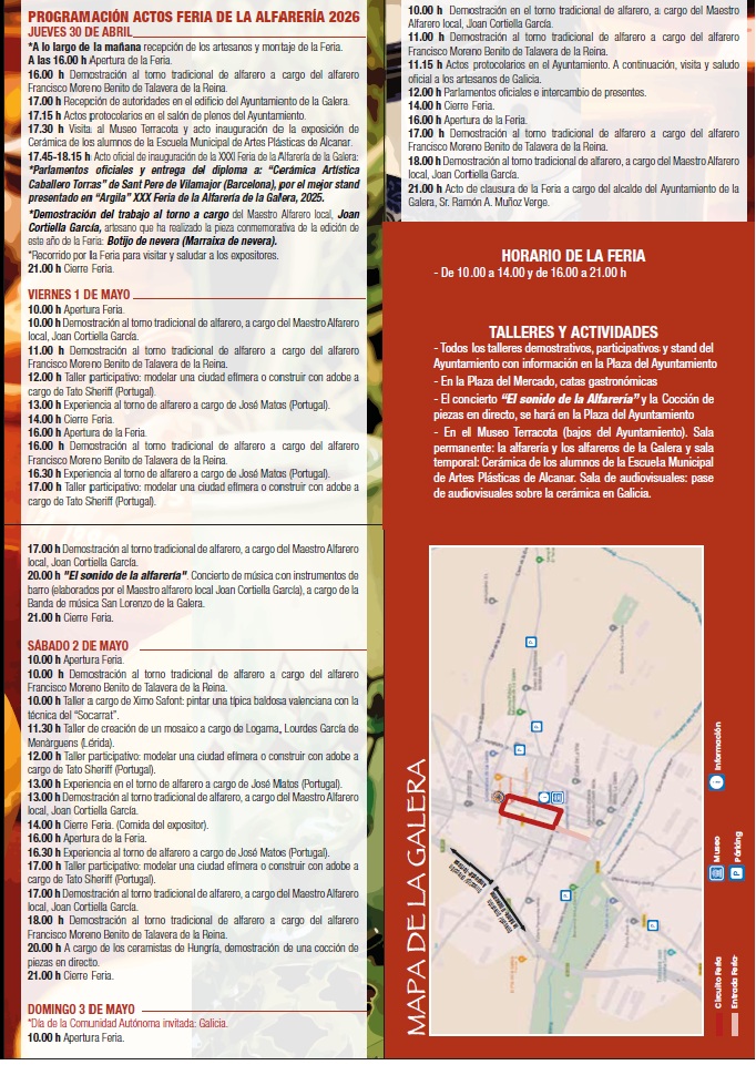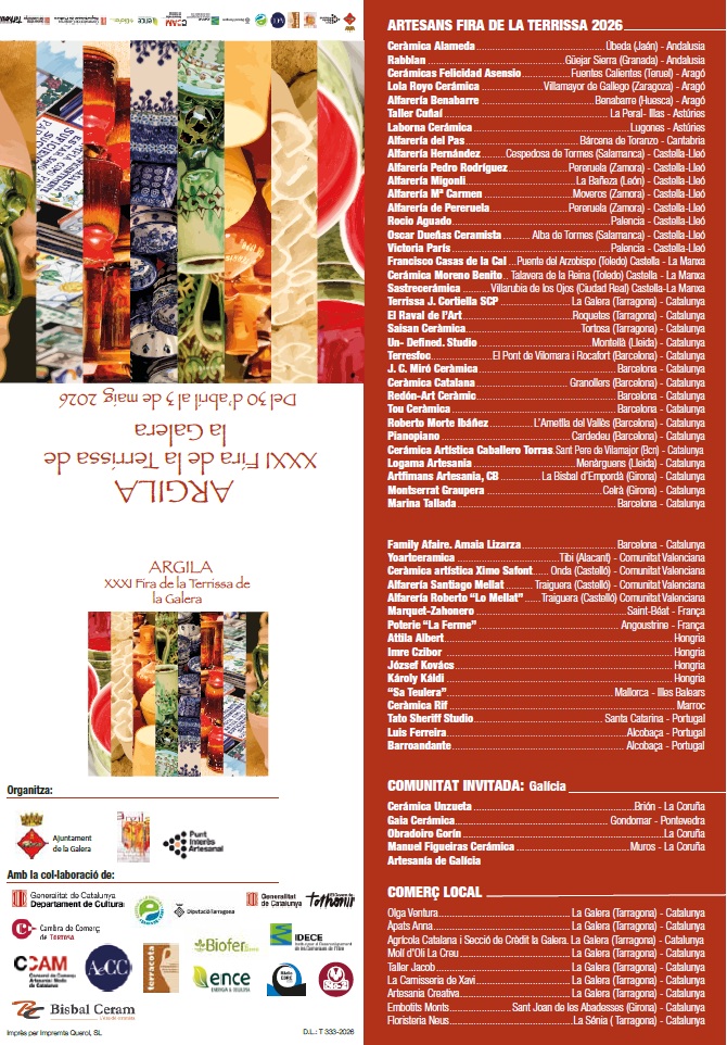 L’acte d’inauguració de la Fira de la Terrissa de la Galera, tindrà lloc el 30 d’abril, a les 17.00 h i el dia de 3 maig, se celebrarà el dia de la Comunitat convidada: Galícia