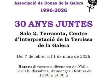 Del 7 de febrer a l’1 de març de 2026, la Sala 2, sala d'exposicions temporals de Terracota, Centre d'Interpretació de la Terrissa de la Galera (baixos de l’Ajuntament) acollirà una exposició commemorativa dels 30 anys de l’Associació de Dones de la Galera: “30 anys juntes”