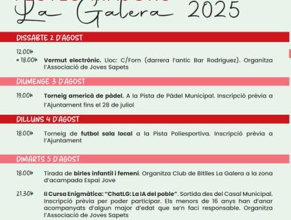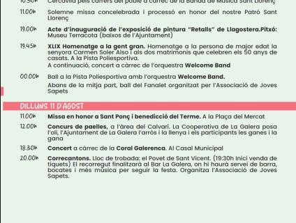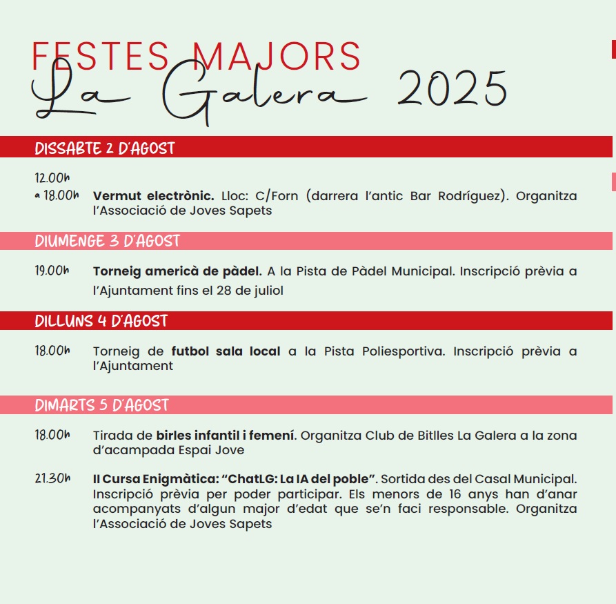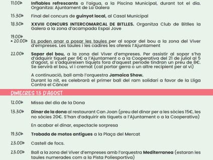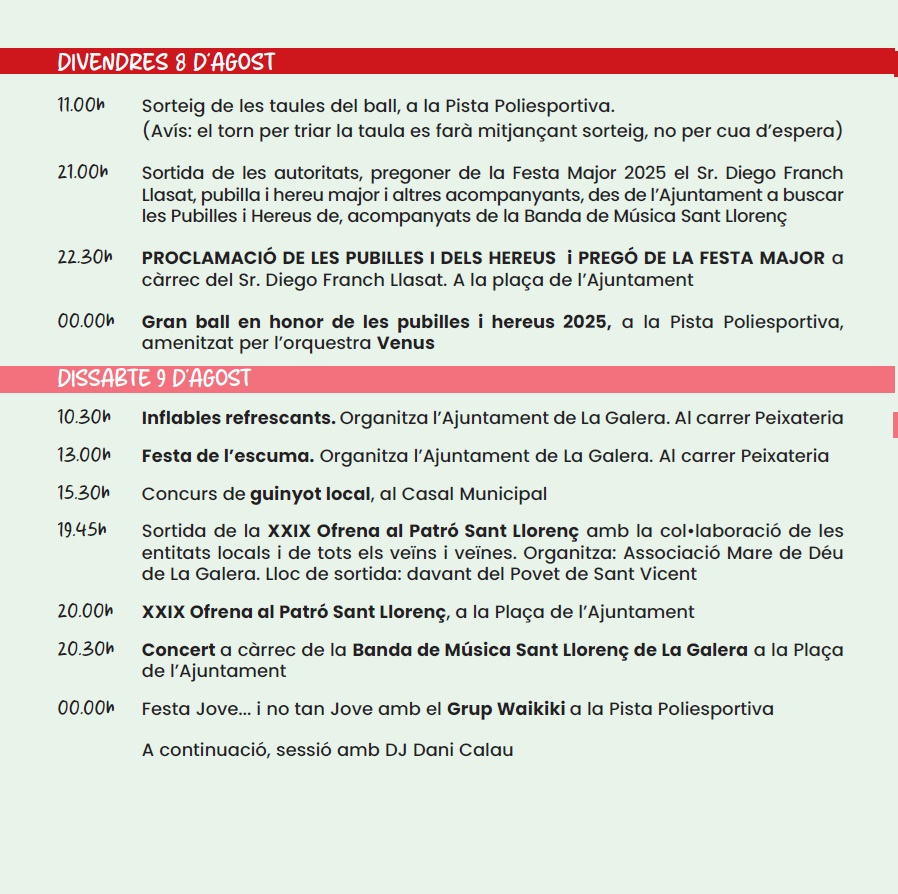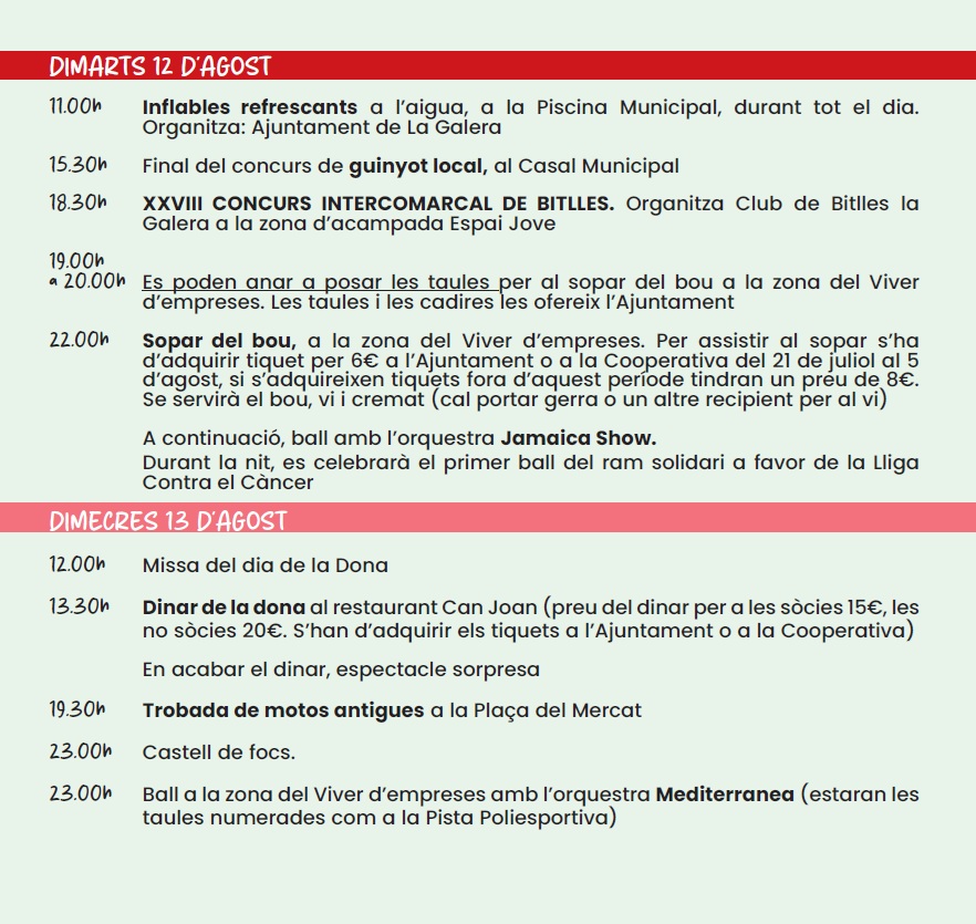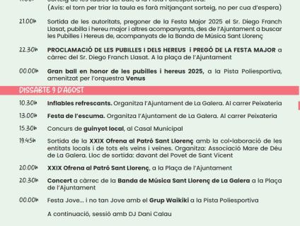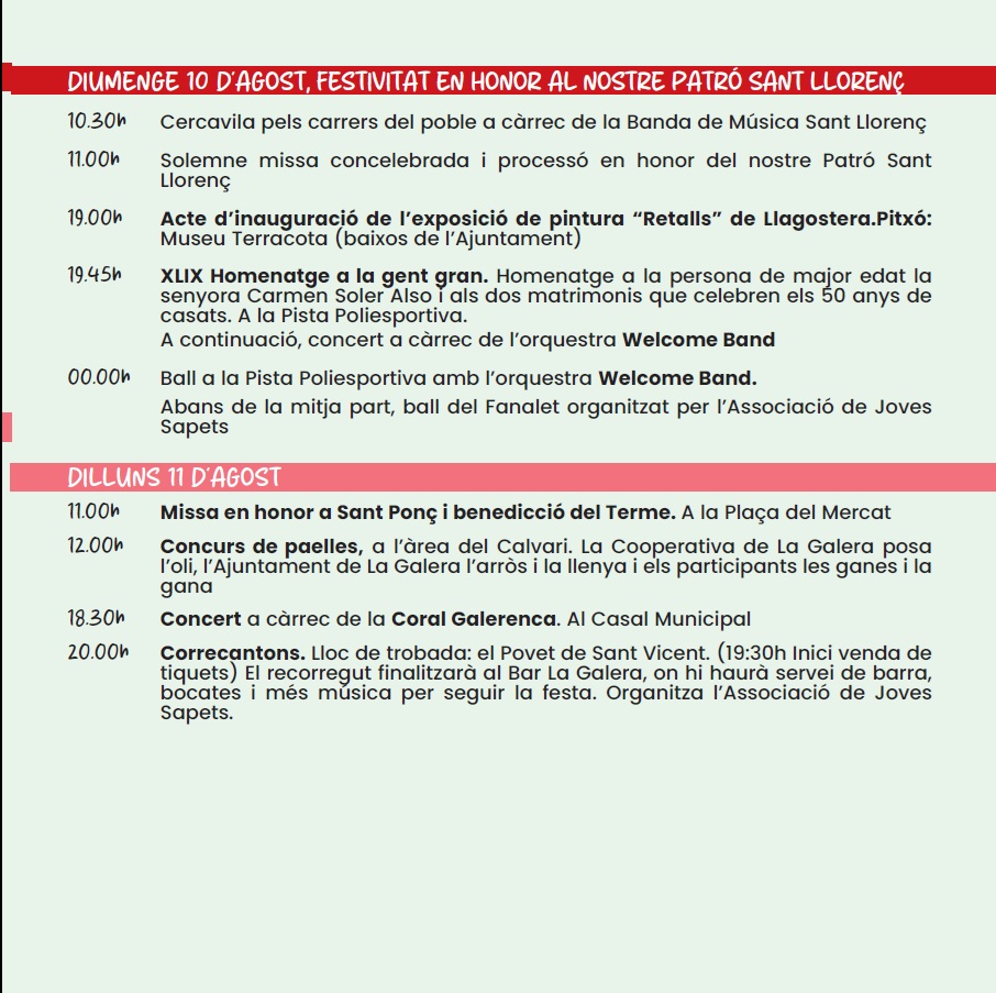 Del 6 al 13 d'agost, tindran lloc les Festes Majors de la Galera, en honor a Sant Llorenç.