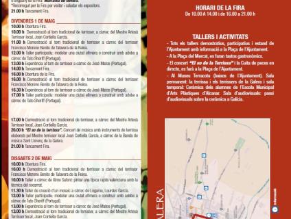 L’acte d’inauguració de la Fira de la Terrissa de la Galera, tindrà lloc el 30 d’abril, a les 17.00 h i el dia de 3 maig, se celebrarà el dia de la Comunitat convidada: Galícia
